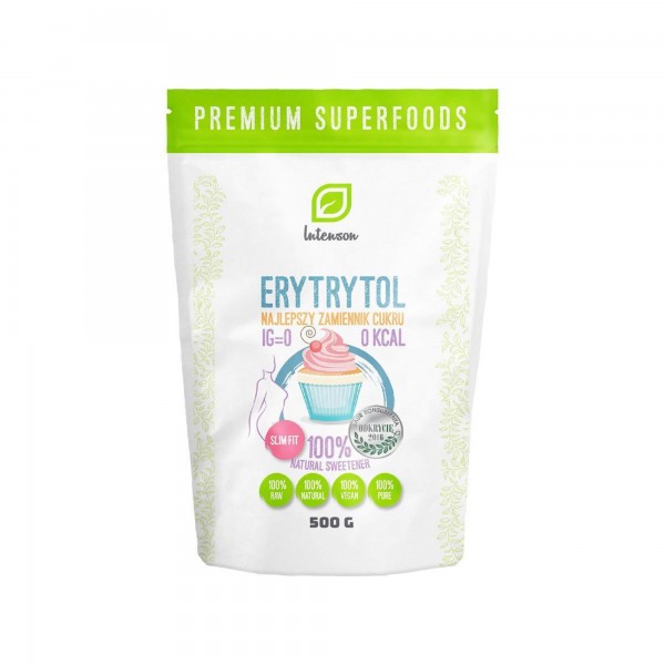 Intenson przy produkcji stosuje najnowocześniejsze rozwiązania, a produkty są certyfikowane. Erytrytol to jeden z najzdrowszych i naturalnych słodzików. Ma zero kalorii, przez co jest idealny dla osób odchudzających się. Charakteryzuje się delikatnym, słodkawym smakiem. Po spożyciu jest szybko eliminowany z organizmu. Może być stosowany przez diabetyków. Erytrytol pomaga w zachowaniu mineralizacji zębów oraz nie przyczynia się do rozwoju próchnicy. Należy pamiętać, że erytrytol nie jest tak słodki jak tradycyjny cukier i osiąga około 75% jego słodyczy.