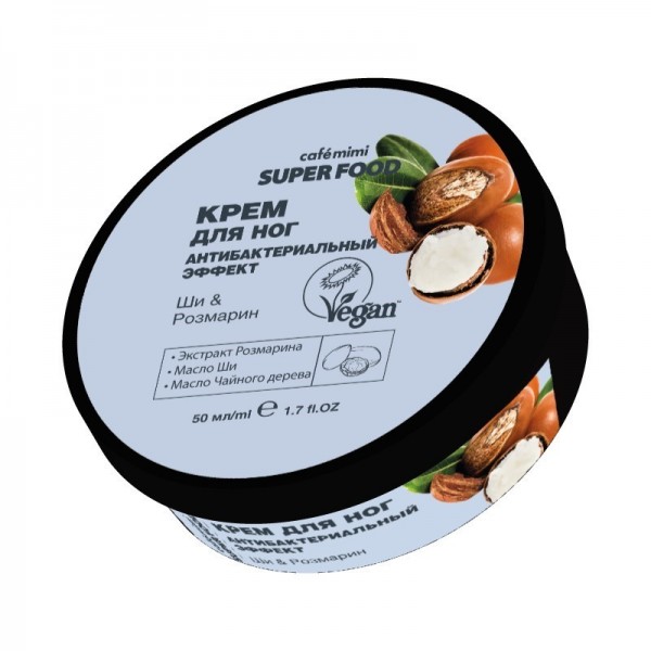 Krem do stóp z rozmarynem i olejkiem eterycznym z drzewa herbacianego działa antybakteryjnie, przeciwzapalnie i antyseptycznie. Masło Shea odżywia, nawilża i zmiękcza skórę stóp.