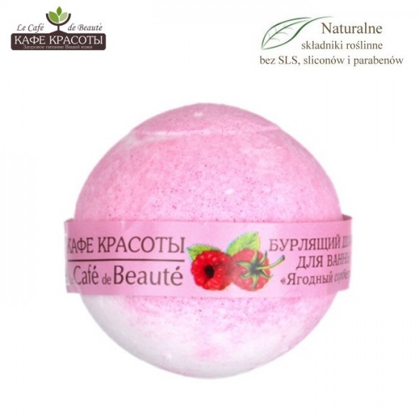 Musująca kula do kąpieli – sorbet malinowy. Soda oczyszczona zmiękcza wodę, ekstrakt maliny odżywia i zmiękcza skórę, nasyca ją witaminami. Olej z pestek winogron tonizuje skórę, stymuluje procesy metaboliczne, aktywnie odżywia. Naturalne olejki aromatyczne nadają kąpieli właściwości aromaterapeutyczne co powoduje, że kąpiel jest wspaniałym relaksem.