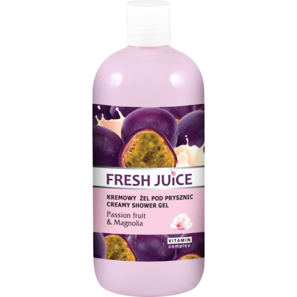 Żel pod prysznic z ekstraktem z marakui i magnolii doskonale oczyszcza skórę oraz kusi świeżym, egzotycznym zapachem. Skóra jest rozpieszczana ekstraktami, dzięki którym staje się gładka, nawilżona i jedwabista w dotyku. Zyskuje również na jędrności elastyczności, pozostawia świeży i egzotyczny zapach marakui i magnolii. Delikatnie, ale skutecznie oczyszcza skórę całego ciała zmiękcza, wygładza i ujędrnia skórę. Pielęgnacja i oczyszczanie w jednym produkcie? To możliwe dzięki żelowi pod prysznic od marki Fresh Juice. Składniki oczyszczające delikatnie usuwają wszelkie zanieczyszczenia, a ekstrakty roślinne kondycjonują skórę i poprawiają jej wygląd. Ekstrakt z marakui i magnolii to nie tylko dawka egzotycznego odświeżenia, ale również solidna porcja nawilżenia, odżywienia i wygładzenia skóry. Masło shea zawarte w składzie dodatkowo regeneruje i nie dopuszcza do nadmiernego przesuszenia. Zwiększa również elastyczność i jędrność skóry.